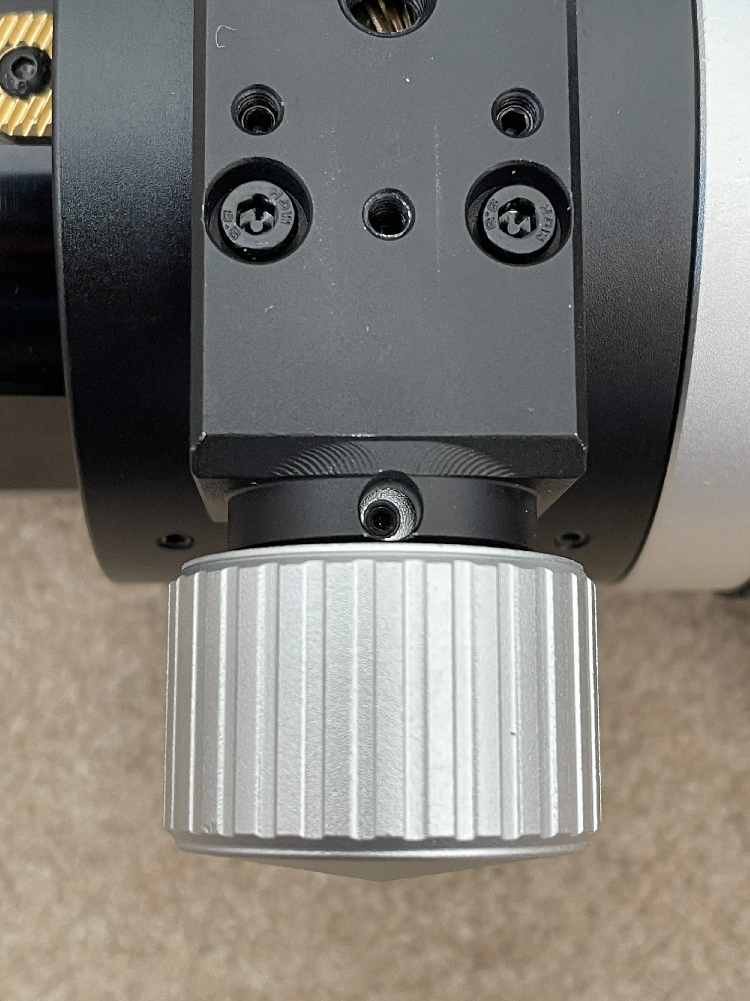 1. Use the fine focus arrows to set the grub screw hole in the fine tune knob to its top position or so that it lines up with something so you can check for reproducibility