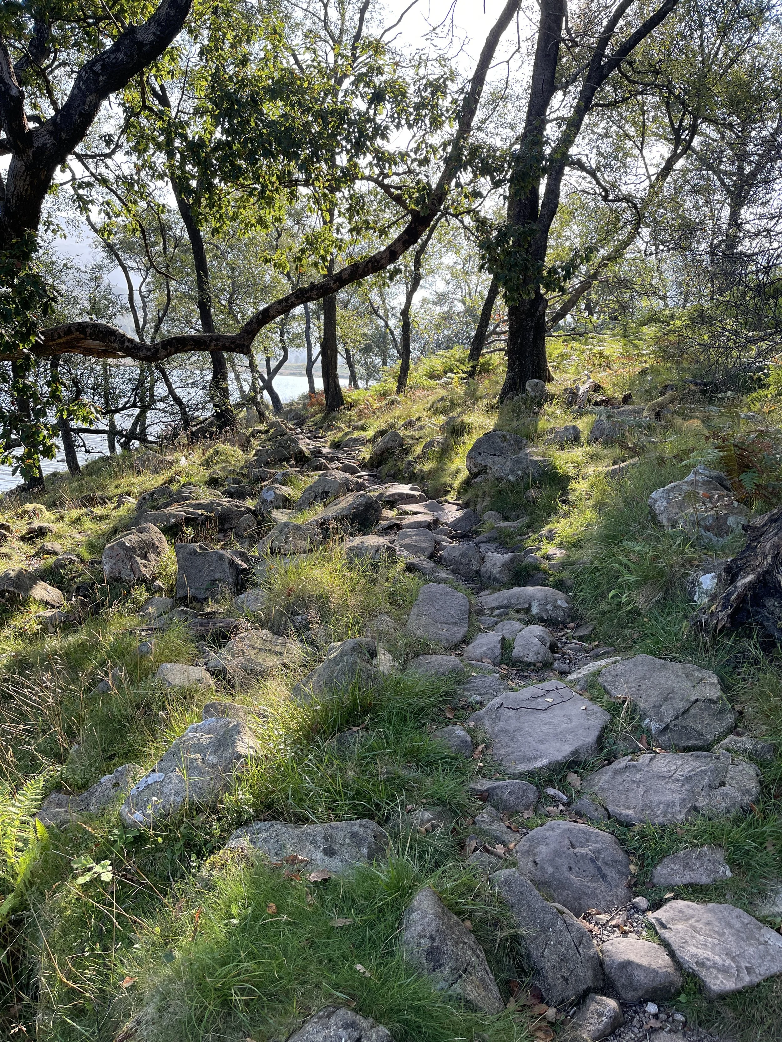 The path rises quite steeply up a scree covered surface that can sometime be unstable before reaching Angler’s Crag and Robin Hood’s Chair. This is a particularly rocky outcrop that you have to scramble over. It’s easier to keep away from the edge and go higher as the drop is fairly significant and sheer. There is then a steep descent down the rock face back to the path. If it’s not busy, it is well worth spending a little time sitting on Robin Hood’s Chair taking in the views along the lake.