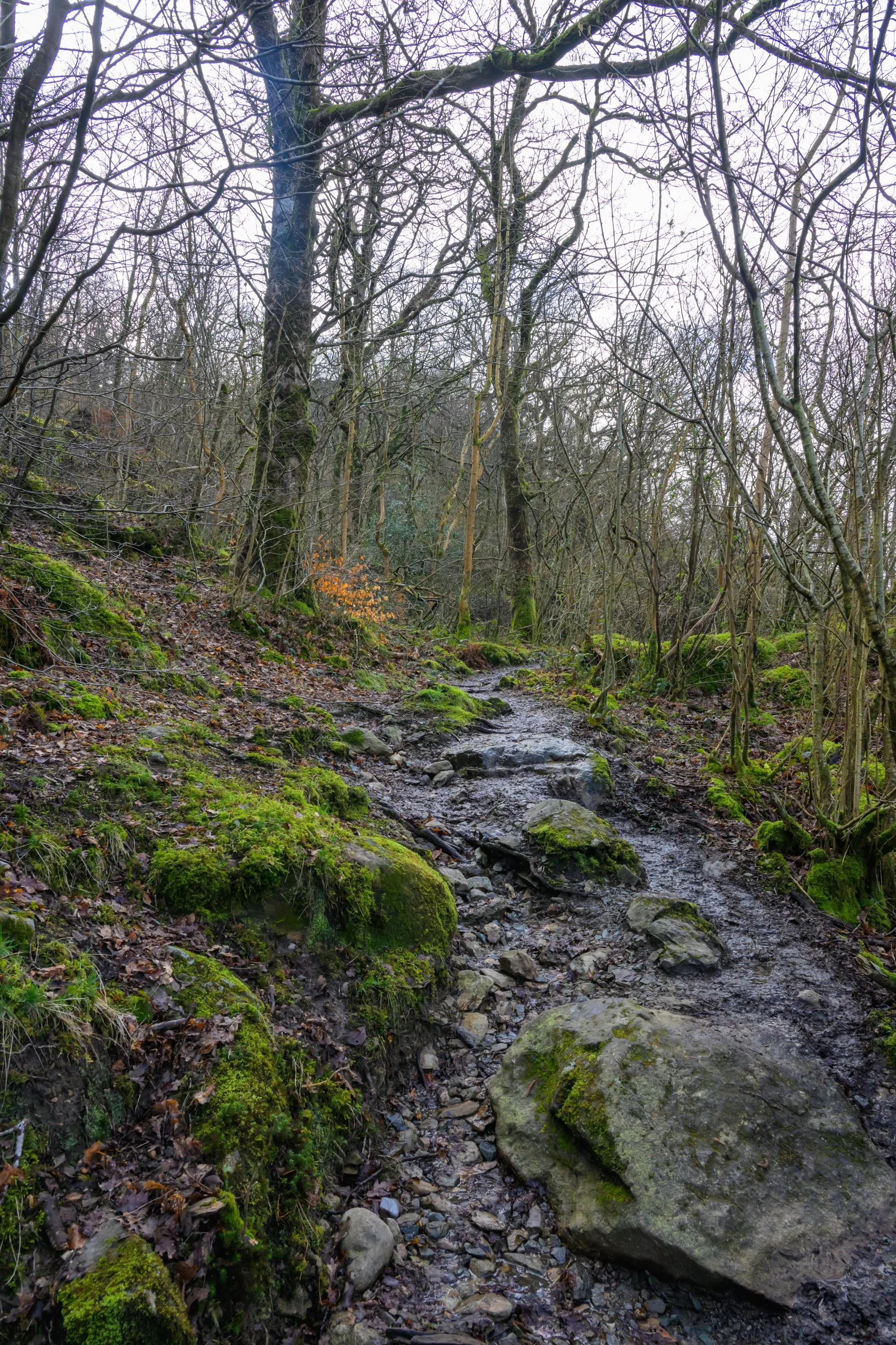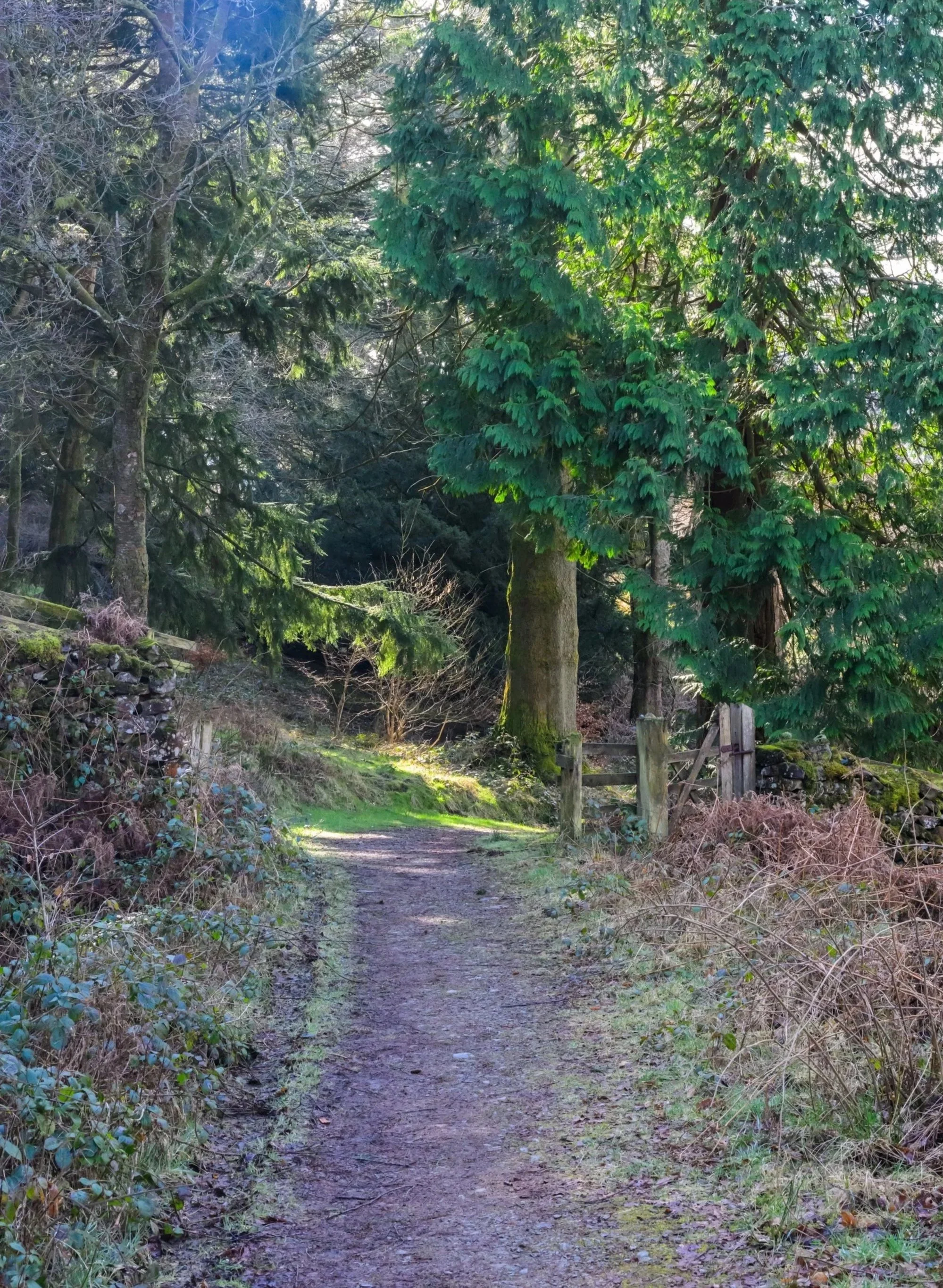 Retrace your steps back from the dam until you reach the road barrier and you will see a United Utilities permitted path up into Greathow Wood. Head up the steps and follow the path into the woods.